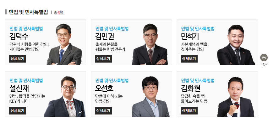 특히 1차 과목은 시험 합격의 자신감을 심어 줘야 하기 때문에 반드시 합격할 교수진을 선택해야 하고, 본인과 잘 맞는지 아닌지 선택해야 합니다. 저도 처음에 민법 교수진 잘못 선택 했다가 나중에 바꾼 케이스라, 특히 민법 교수진은 신중히 선택하시기 바랍니다.