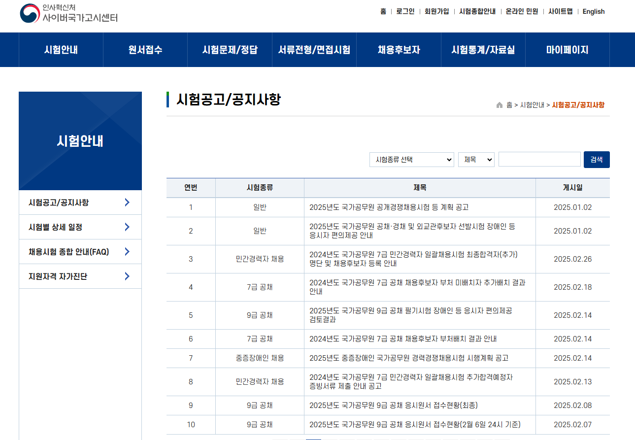국가공무원시험 각종 채용인원과 시험일정 발표는 인사혁신처 사이버국가고시센터에서 바로바로 확인이 가능합니다.