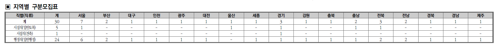 다음은 지역별 구분모집표 입니다. 시설직 일반토목과 시설직 건축, 행정직 일반행정은 전국단위 외에도 지열별로 채용인원이 정해져 있습니다.